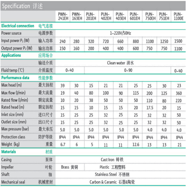 離心泵PUN-751EH◆·離心式葉輪。◆·結(jié)構(gòu)緊湊,易安裝,易維護(hù)。◆·各種機(jī)床配套。◆·家庭,花園供水。◆·小型暖通空調(diào)循環(huán)系統(tǒng),空氣能系統(tǒng)。◆·泵體:鑄鐵。◆·泵軸:不銹鋼。◆·葉輪:工程塑料。◆·機(jī)封:石墨+陶瓷。◆·耐溫:0-90°C